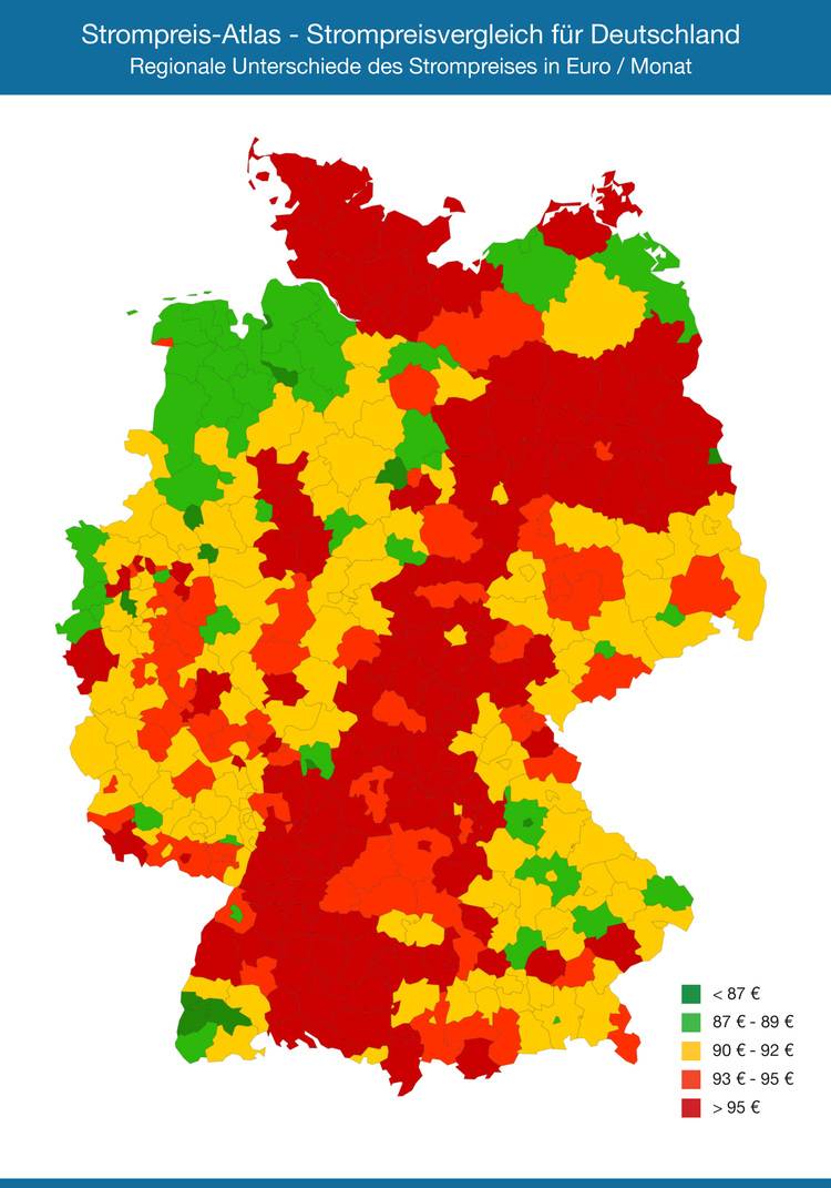 Wie viel Geld Verbraucher für Strom in Deutschland ausgeben hängt neben dem Verbrauch auch vom Wohnort ab. Im Durchschnitt bezahlt ein Musterhaushalt mit einem Jahresverbrauch von 3.500 kWh 1.127 Euro pro Jahr in der Grundversorgung und 959 Euro beim günstigsten Alternativanbieter. Deutlich sichtbar werden die regionalen Preisunterschiede im Atlas für Strompreise. Dort werden deutschlandweit die aktuellen monatlichen Strompreise für 6.400 Städte, Landkreise und kreisfreie Städte visualisiert. Die Strompreise sind farblich unterschiedlich dargestellt (rot = teuer, grün = günstig), so dass die Karte auf einen Blick zeigt, wo Strom in Deutschland eher günstig oder teurer ist. Grundlage ist ein Jahresverbrauch von 3.500 kWh.