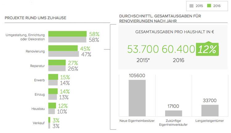 Auch das Jahr 2017 könnte ein weiteres erfolgreiches Jahr für Hausrenovierungen werden. Im laufenden Jahr investieren Hausbesitzer durchschnittlich 18.500 Euro in die Hausrenovierung, mehr als im Jahr 2016 mit 18.200 Euro.