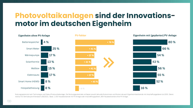Photovoltaik gilt als Schlüsseltechnologie. Wer bereits eine PV-Anlage besitzt, investiert häufiger auch in weitere Lösungen wie E-Auto, Speicher oder Wärmepumpe. Die Bereitschaft, privat in die Energiewende zu investieren, ist hoch – unabhängig von der politischen Einstellung.