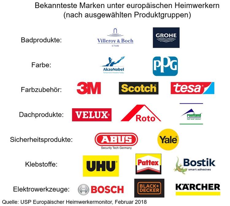 Generell zeigt sich: Investitionen in die Marke scheinen im DIY-Segment langfristig zum Erfolg zu führen – gerade auch bei vielen deutschen Herstellern mit internationaler Marktpräsenz. In der Studie "Europäischer Heimwerker- und Renovierungsmonitor" der USP Marketing Consultancy-Gruppe, zu der auch BauInfoConsult gehört, wurde die Bekanntheit der Marken unter 400 privaten Heimwerkern in Deutschland, Österreich, Frankreich, den Beneluxstaaten, Spanien, Italien, Großbritannien, Polen, Dänemark und Schweden abgefragt. Natürlich unterschieden sich die Ergebnisse je nach Land und Produktsegment. Über alle Länder hinweg lassen sich dennoch klare europäische Siegermarken ermitteln. In den sieben Baumarkt-Produktbereichen Bad, Farbe, Farbzubehör, Dachprodukte, Sicherheitsprodukte, Klebstoffe und Elektro-Werkzeugen sind die folgenden Marken im europäischen Gesamtschnitt am bekanntesten: