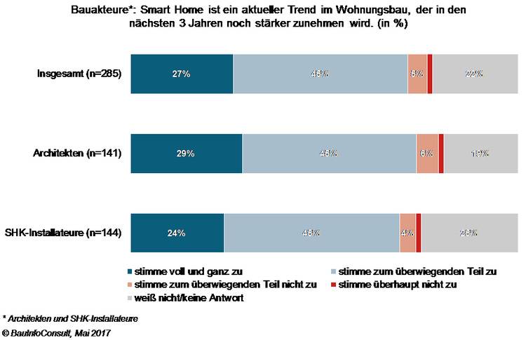 In der aktuellen Jahresanalyse von BauInfoConsult wurden unter anderem 285 Architekten und SHK-Profis um Ihre Einschätzung gebeten, ob Smart Home auch zukünftig als Trend am Markt spürbar sein wird. Die Antwort darauf ist eindeutig: Ja. Egal, ob nun kostspielige Lösungen oder nur einfache Systeme: Fakt ist, dass Smart Home in den nächsten drei Jahren verstärkt im Wohnungsbau präsent sein wird – zumindest prognostizieren dies fast drei Viertel (72 Prozent) der befragten Bauakteure.