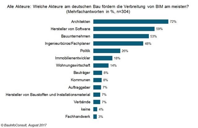 Im Zuge der Trendstudie zum Stand der BIM-Nutzung in Deutschland hat BauInfoConsult 304 mitarbeiterstarke Architektur- und Ingenieurbüros sowie größere Verarbeiter in telefonischen Interviews zu ihren Erwartungen und Erfahrungen mit BIM befragt. Dabei ging es auch um die aktuellen Multiplikatoren von BIM: Die Architekten werden gemeinhin als die Akteure am deutschen Bau gesehen, die für die Verbreitung von BIM in Deutschland die größte Rolle spielen: Insgesamt drei von vier Befragten aus allen Berufsgruppen sind dieser Ansicht.