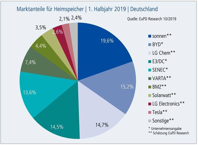Die Darstellung der Marktanteile für Heimspeicher in Deutschland basiert auf einer umfangreichen Anbieterbefragung, Installateurs- und Endkundenbefragungen sowie ergänzenden Recherchen durch EuPD Research. Hierbei wurde die Annahme getroffen, dass bei Anbietern mit vornehmlich zweistufigem Vertrieb 10 % der Speicher sich im Verkaufsprozess bzw. im Lager befinden und somit noch nicht installiert wurden. Bei Anbietern mit überwiegend dreistufigem Vertrieb wurden hierbei 15 % unterstellt.