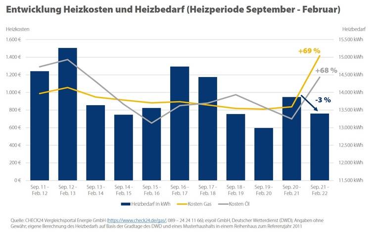 Ein Haushalt mit einer Gasheizung zahlt in der aktuellen Heizperiode von September bis Februar 1.415 Euro und damit 69 Prozent mehr als im Vorjahr. Verbraucher*innen mit Ölheizung müssen mit 1.172 Euro rund 68 Prozent mehr zahlen als in der Vorjahresperiode.