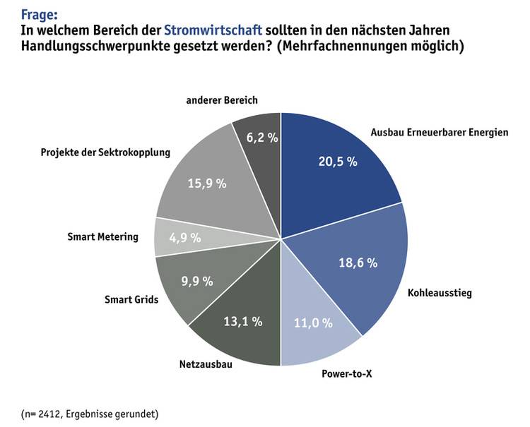 Der Kohleausstieg (18,6%) und der Ausbau der erneuerbaren Energien (20,5%) wurden als die wichtigsten Aufgaben genannt, die es jetzt anzupacken gelte, um die Energiewende im Strombereich voranzubringen. Die Kopplung des Stromsektors mit dem Gebäude- und Verkehrsbereich wurde von 15,9% als dringliche Aufgabe gesehen (Mehrfachnennungen waren möglich). Im Gebäudebereich sah mehr als ein Drittel der Befragten (34,3%) die Modernisierung der Heizungsanlage als primäre Maßnahme an – deutlich vor Maßnahmen an der Gebäudehülle (24,9%).