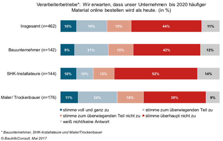Auch wenn aktuelle Studienergebnisse belegen, dass in etwa nur jeder fünfte Einkauf größerer Baubetriebe über den digitalen Weg abgewickelt wird, stellt sich die Frage nach dem Wachstumspotenzial dieses Distributionsweges. Aktuelle Studienergebnisse von BauInfoConsult zeigen, dass fast jeder dritte Verarbeiterbetrieb davon ausgeht bis zum Jahr 2020 seine Bau- und Installationsmaterialien häufiger online zu beziehen. Allerdings scheinen fast zwei Drittel der Befragten diesem Einkaufsweg immer noch skeptisch gegenüber zu stehen.