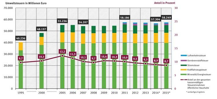 Von 2000 bis 2015 haben sich nach einer Auswertung des Umweltbundesamts die umweltbezogenen Steuern um 21 % erhöht, die Steuern insgesamt stiegen jedoch um 44 %. Mit der Einführung der ökologischen Steuerreform im Jahr 1999 sind die Einnahmen umweltbezogener Steuern in Deutschland deutlich gestiegen.