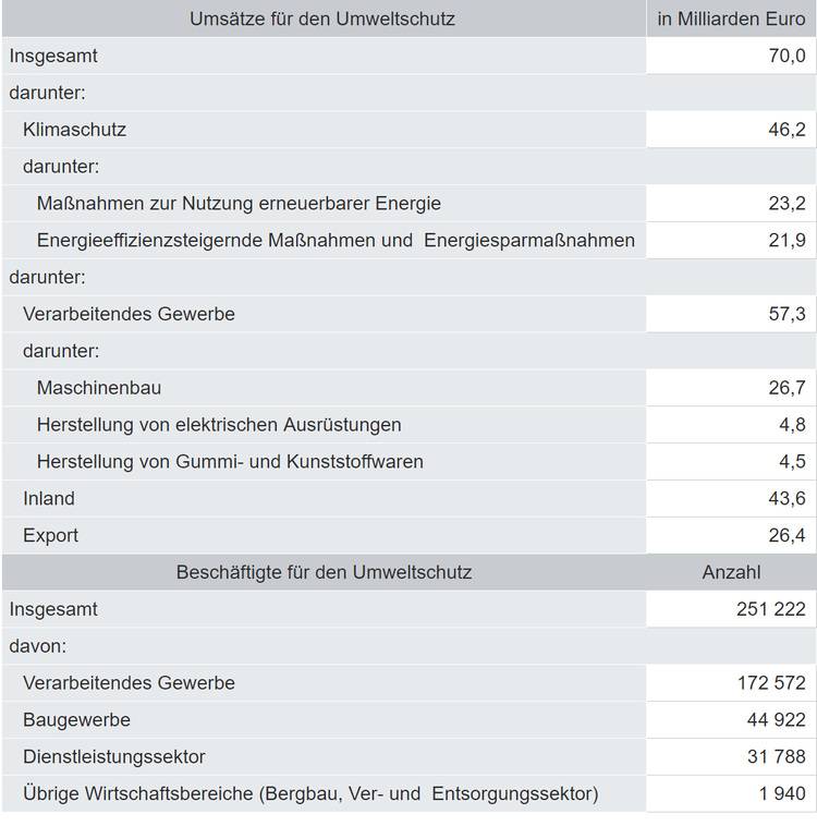 Der Großteil der umweltschutzbezogenen Umsätze wurde mit 57,3 Milliarden Euro (81,9 %) im Verarbeitenden Gewerbe erzielt. Die wichtigsten Wirtschaftszweige waren dabei der Maschinenbau (26,7 Milliarden Euro), die Herstellung von elektrischen Ausrüstungen (4,8 Milliarden Euro) sowie die Herstellung von Gummi- und Kunststoffwaren (4,5 Milliarden Euro).