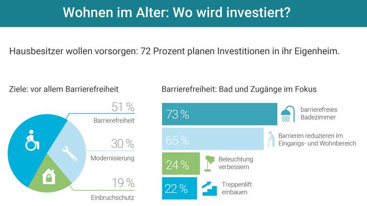 Die Mehrheit der Befragten (65 Prozent) macht sich Gedanken über die Wohnsituation im Alter. Aber nur knapp 18 Prozent haben bereits konkrete Maßnahmen geplant. Dass Handlungsbedarf besteht, um auch später selbstständig im eigenen Haus wohnen zu können, ist den 279 Befragten durchaus bewusst. 72 Prozent planen Investitionen in ihr Haus. Am wichtigsten ist ihnen dabei das Beseitigen von Barrieren im Badezimmer sowie im Eingangs- und Wohnbereich.