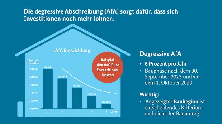 Anmerkung: Die degressive AfA ergänzt die Erhöhung der linearen AfA von 2 auf 3 Prozent und die Sonder-AfA für besonders klimafreundlichen Mietwohnungsneubau.