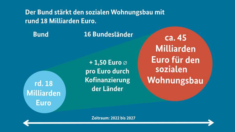 Die Bundesregierung hat vorgeschlagen, den Ländern im Zeitraum von 2022 bis 2027 Programmmittel in Höhe von insgesamt 18,15 Milliarden Euro für den sozialen Wohnungsbau zur Verfügung zu stellen. Jeder Euro des Bundes wird aktuell durch rund 1,50 Euro der Länder kofinanziert. Bei Fortführung dieser bisherigen Komplementärfinanzierung stehen damit gesamtstaatlich rd. 45 Milliarden Euro für den sozialen Wohnungsbau bis 2027 zur Verfügung. Bund und Länder übernehmen damit weiterhin gemeinsam Verantwortung.