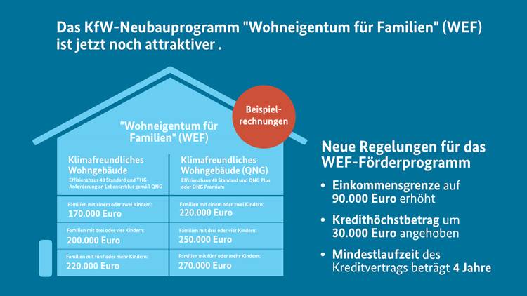 Beim WEF werden die Kredithöchstbeträge um 30.000 Euro angehoben. Außerdem wird die Grenze des zu versteuernden Einkommens, bis zu dem ein zinsvergünstigtes Darlehen beantragt werden kann, von 60.000 Euro/Jahr auf 90.000 Euro/Jahr angehoben. Damit können noch mehr Familien das Programm in Anspruch nehmen.