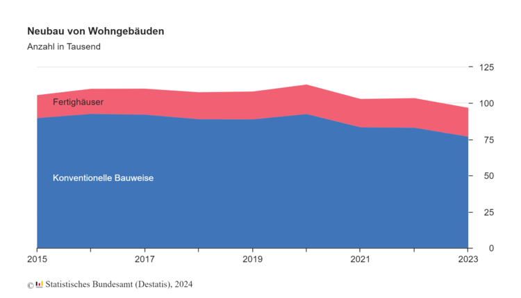 Der Neubau von Wohngebäuden in konventioneller Bauweise ging 2023 gegenüber dem Vorjahr um 7,5 % auf 76.900 zurück. Insgesamt war im Jahr 2023 fast jedes vierte (20,6 %) fertiggestellte Wohngebäude ein vorgefertigtes Haus aus der Fabrik (2022: 19,7 %). Häuser aus Fertigteilen werden angesichts gestiegener Baukosten und Wohnungsmangel als möglicherweise günstigere und zeitsparende Alternative diskutiert.