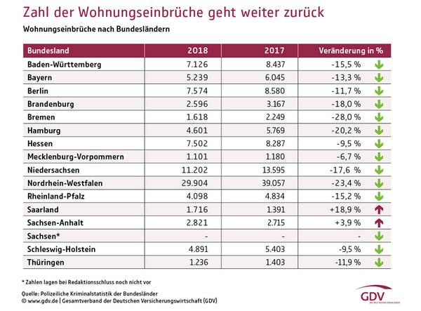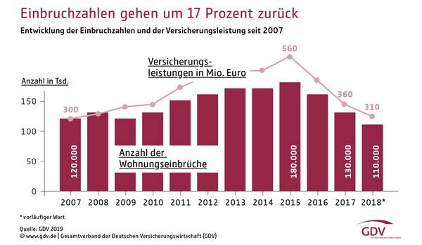 Rund 110.000 Wohnungseinbrüche wurden den deutschen Versicherern 2018 gemeldet. Das sind rund 20.000 weniger als im Vorjahr. Auch die Schadenhöhe ist um 50 Millionen Euro gesunken und liegt mit 310 Millionen Euro auf dem niedrigsten Stand seit dem Jahr 2007.