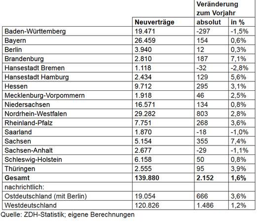Die Neuvertragszahlen sind in den meisten Bundesländern mindestens näherungsweise stabil geblieben oder aber gewachsen. Nur in Baden-Württemberg, Bremen, Sachsen-Anhalt und Saarland gingen die Neuvertragszahlen zurück. In den ostdeutschen Bundesländern insgesamt stieg die Zahl der Neuverträge im Handwerk sogar stärker als im Gesamtschnitt.