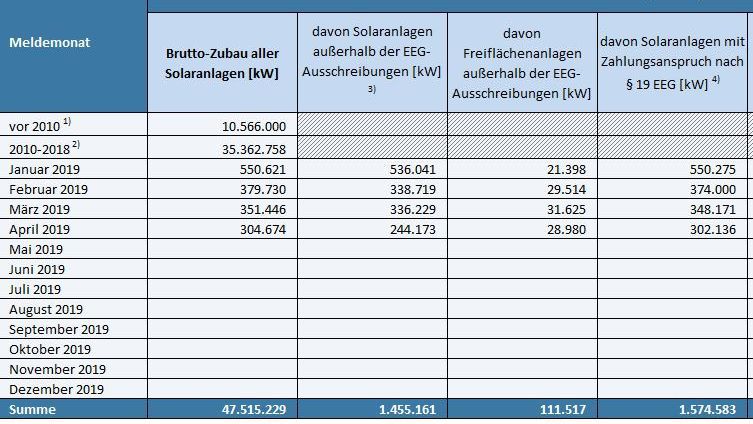 Der gesamte Zubau in Deutschland liegt Ende April 2019 damit bei 47,4 Gigawatt Leistung.