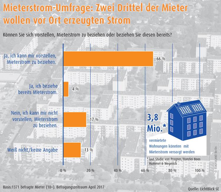 Am 26.05.2017 hat das Bundeskabinett den vom Bundeswirtschaftsministerium vorgelegten Gesetzentwurf zur Förderung von Mieterstrom beschlossen. Damit ist der Weg für die Förderung von Mieterstrom geebnet und Unternehmen sowie Dienstleister können sich bei der Umsetzung neuer Projekte auf einheitliche Rahmenbedingungen verlassen. Dass ein Handeln seitens der Gesetzgeber dringend notwendig ist, zeigt eine repräsentative Umfrage des Meinungsforschungsinstituts YouGov im Auftrag des Energie- und IT-Unternehmens LichtBlick: 66% der befragten Mieter können sich vorstellen, Mieterstrom zu beziehen. Lediglich jeder sechste Mieter würde sich gegen Mieterstrom entscheiden.