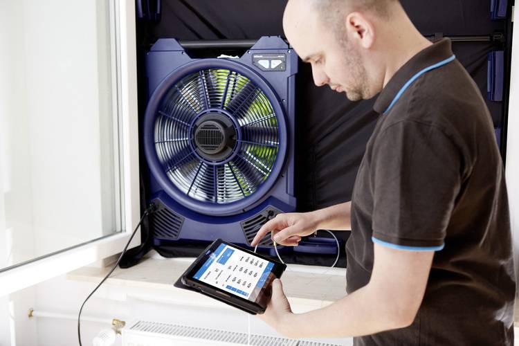Blower Door Messungen lassen sich effektiv und normgerecht mit der Wöhler BC 600 Blower Check durchführen. Der Messdienstleister wählt nämlich nur noch die anzuwendende Norm aus und den Rest erledigt das Gerät automatisch. Dabei sorgt die präzise Sensorik dafür, dass die geforderte Messgenauigkeit sicher eingehalten wird. Mit dem Einbaurahmen und dem Klammersystem wird die Ventilatoreinheit der Wöhler BC 600 mit wenigen Handgriffen dicht in Fenster oder Tür eingesetzt, und das selbst bei schwierigen Einbausituationen. Unter- und Überdruckmessungen können anschließend direkt hintereinander ohne Umbau der Messanordnung vollautomatisch durchgeführt werden, denn der Ventilator wechselt von selbst die Förderrichtung. Zusatzblenden werden für die Messung nicht benötigt.