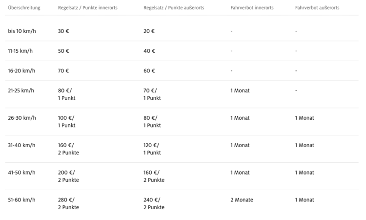 Die Strafen fürs Zu-Schnell-Fahren werden drastisch erhöht. So droht ein einmonatiges Fahrverbot bereits ab einer Überschreitung der Geschwindigkeitsbegrenzung um 21 km/h (innerorts) bzw. 26 km/h (außerorts). Zusätzlich gibt es einen Punkt in Flensburg. Bis zu einer Überschreitung von 20 km/h wird nur eine Geldstrafe fällig.
