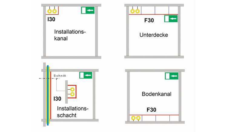 In der Regel ist dann eine brandschutztechnische Kapselung durch die Verlegung innerhalb von Unterdecken, Bodenkanälen oder Installationsschächten mit einer Feuerwiderstandsdauer von 30 Minuten (F 30) erforderlich (Bild 4).
