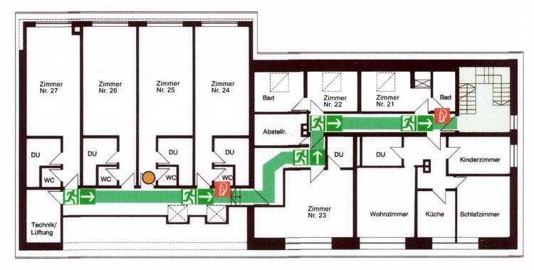 In Beherbergungsstätten mit insgesamt nicht mehr als 60 Gastbetten genügt als zweiter Rettungsweg eine mit Rettungsgeräten der Feuerwehr erreichbare Stelle des Beherbergungsraumes; dies gilt nicht, wenn in einem Geschoss mehr als 30 Gastbetten vorhanden sind. Die Länge zum Erreichen des Ausgangs ins Freie oder eines notwendigen Treppenraums darf maximal 35 m betragen. Gemäß § 6 müssen Bekleidungen, Unterdecken und Dämmstoffe in notwendigen Fluren aus nichtbrennbaren Baustoffen; Bodenbeläge aus mindestens schwerentflammbaren Baustoffen bestehen. Gemäß § 12 sind am Ausgang jedes Beherbergungsraumes ein Rettungswegplan und Hinweise zum Verhalten bei einem Brand anzubringen (Bild 3).