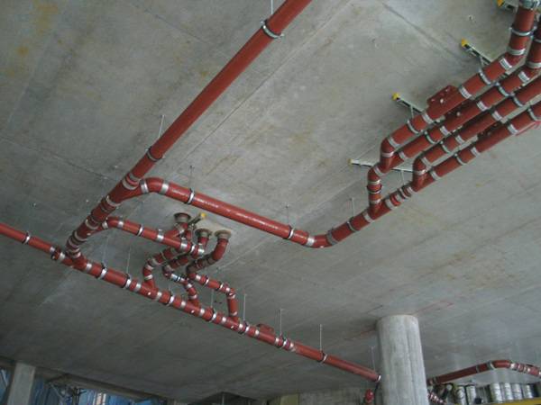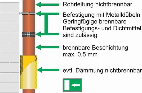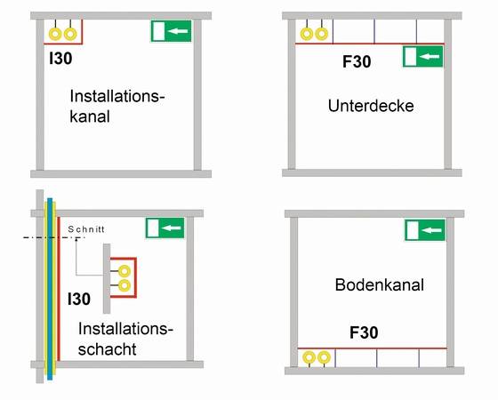 Bei der Verlegung von Leitungsanlagen innerhalb der Rettungswege von Versammlungsstätten gilt der Abschnitt 3 der Muster-Leitungsanlagen-Richtlinie (MLAR), Fassung 10. Februar 2015 (Redaktionsstand 5. April 2016). Im Abschnitt 3 der MLAR sind die grundlegenden Voraussetzungen für sichere Flucht- und Rettungswege festgelegt. Hiernach dürfen brennbare Leitungen in Flucht- und Rettungswegen nicht frei verlegt werden. In der Regel ist dann eine brandschutztechnische Kapselung durch die Verlegung innerhalb von Unterdecken, Bodenkanälen oder Installationsschächten mit einer Feuerwiderstandsdauer von 30 Minuten (F 30) erforderlich (Bild 1). Nichtbrennbare Leitungen, zum Beispiel gusseiserne Abflussrohrsysteme, dürfen hingegen in Flucht- und Rettungswegen frei verlegt werden (Bild 2).