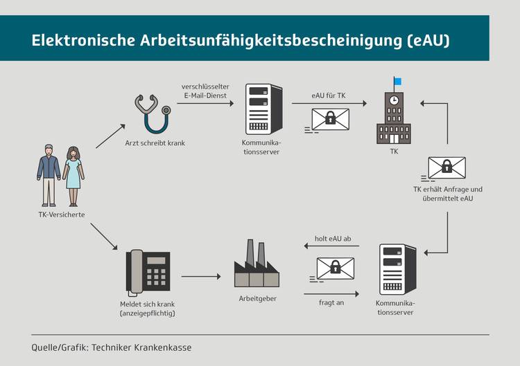 Grundsätzlich informiert der Arbeitnehmer seinen Betrieb nach wie vor als erstes, dass er krank ist. Diese Meldung kann per Telefon, Mail oder auch SMS/WhatsApp erfolgen. War der kranke Mitarbeiter beim Arzt und wurde arbeitsunfähig geschrieben, muss der Arbeitgeber dann von sich aus bei der Krankenkasse anfragen und erhält daraufhin die eAU zugesendet - er muss also aktiv werden.