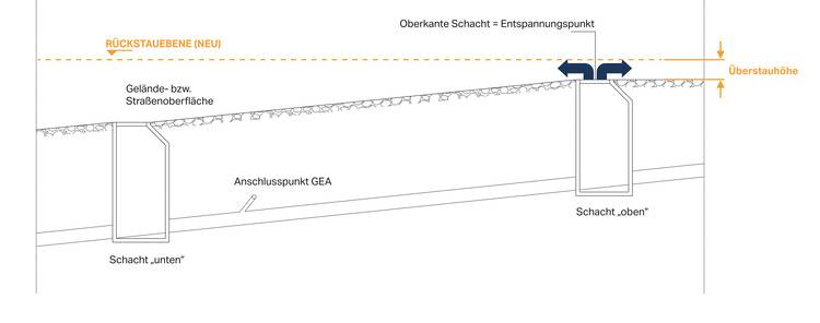 Der Entspannungspunkt entspricht in der Regel dem – entgegen der Fließrichtung betrachtet – nächst gelegenen Schacht des öffentlichen Entwässerungssystems. Die Überstauhöhe kann anhand der örtlichen Gegebenheit und den hydraulischen Verhältnissen im örtlichen Kanalnetz ermittelt werden.