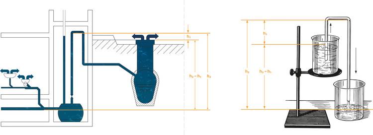 Bei Abwasserhebeanlagen besteht durch den sogenannten Saughebereffekt die Gefahr des Rücksaugens von Schmutzwasser aus dem öffentlichen Abwasserkanal über die Abwasserhebeanlage ins Gebäude. Abb. 3 zeigt die Analogie zum allgemein bekannten Versuch aus dem Physikunterricht. Über die hydrostatische Druckdifferenz kann Flüssigkeit von einem Behälter in einen tiefergelegenen Behälter umgefüllt werden.