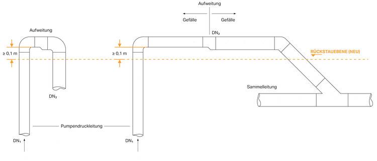 - Zudem ist in der Rückstauschleife eine Aufweitung in die nächstgrößere Rohrdimension vorzusehen.