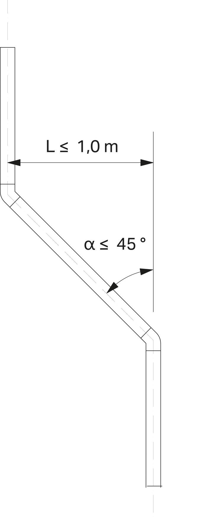 Der Normentwurf unterscheidet nun zwischen Fallleitungsversprüngen und -verziehungen. Bei Versprüngen mit einer maximalen Auslenkung von 1 m und Richtungsänderungen ≤ 45° sind – unabhängig von der Fallleitungslänge – keine besonderen Maßnahmen erforderlich (siehe Abb. 5). Der Versprung bleibt in den Bemessungsregeln für Fallleitungen (DIN 1986-100 – Tab. 8) und kann nennweitengleich ausgeführt werden. Lediglich Anschlüsse innerhalb des Versprungs sind nicht zulässig.