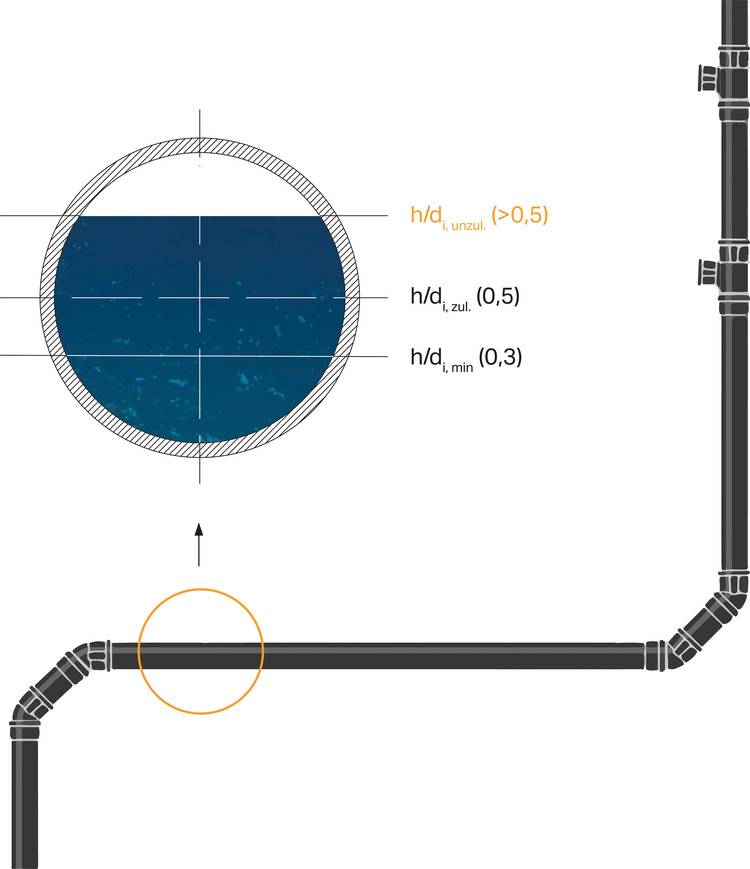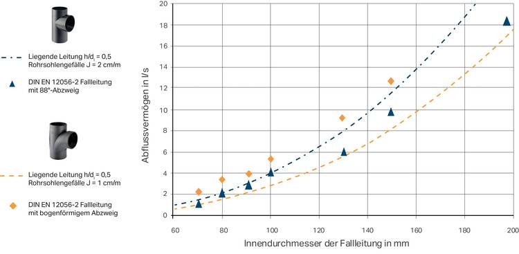 Mit Einführung von DIN EN 12056 in Verbindung mit DIN 1986-100 können Fallleitungen in Abhängigkeit vom Einlaufabzweig (bogenförmig mit Innenradius oder 87-88,5°) wesentlich höher belastet werden. Zugleich wurde das Mindestgefälle für belüftete liegende Leitungen auf J = 0,5 cm/m abgesenkt, wobei sich in der Praxis ein Mindestgefälle von J = 1 cm/m etabliert hat. Abb. 6 verdeutlicht die Zusammenhänge.