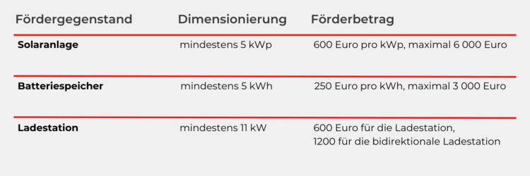 Ab dem 26. September 2023 gilt die neue Förderrichtlinie „Solarstrom für Elektrofahrzeuge“. Gefördert wird die Anschaffung eines „solaren Gesamtsystems“ bestehend aus Photovoltaikanlage, Batteriespeicher und Ladestation für E-Fahrzeuge. Dieses System wird dann mit bis zu 9.600 Euro bezuschusst – wenn bidirektionales Laden möglich ist, sogar mit 10.200 Euro. Antragsberechtigt sind Eigenheimbesitzer, die bereits ein E-Auto fahren oder zum Zeitpunkt der Förderung eines bestellt haben.