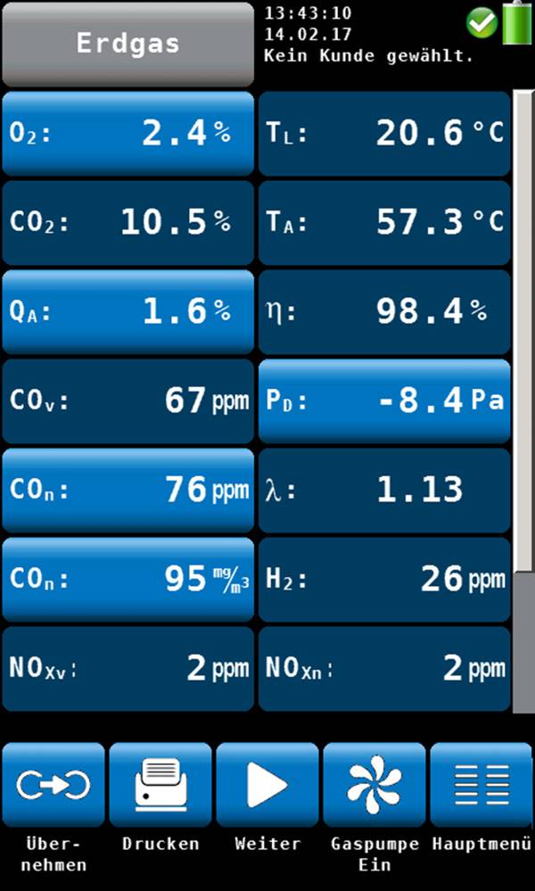 Ein modernes Messgerät ermittelt aus diesen Messdaten dann die Abgasverluste der Anlage. Es fehlen allerdings noch die Temperaturen der Verbrennungsluft und des Abgases. Es versteht sich von selbst, dass mit Abgasen, die extrem heiß ins Freie geblasen werden, keine hohen Wirkungsgrade zu erzielen sind.
