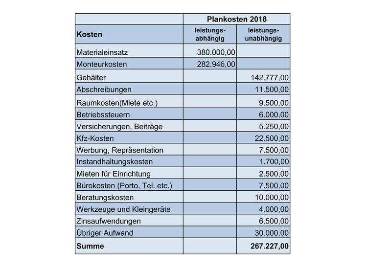 Die genannten Kosten fallen unabhängig davon an, ob der Monteur arbeitet oder nicht. Sie stellen die so genannten leistungsunabhängigen Kosten dar.