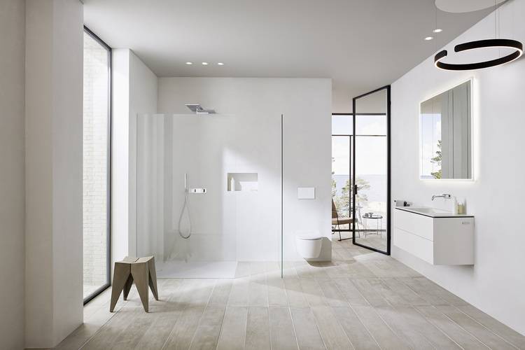 Auch im Duschbereich bietet Geberit ONE in die Vorwand integrierte Elemente: Eine Nischenablagebox als Stauraum für Pflegeprodukte sowie eine rahmenlose Duschtrennwand ohne sichtbare Befestigungswinkel komplettieren das Portfolio. Die Nischenablagebox ist in zwei Größen erhältlich und bereits ab Werk mit einem Dichtvlies ausgestattet. Zudem gibt es sie je nach Ausführung mit verspiegelter Schiebetür oder als befliesbare Variante. So kann der Duschbereich individuell gestaltet werden. Die Duschtrennwand wird im Vorwandsystem verankert und kommt ohne sichtbare Befestigungen aus – für eine einfache Installation und leichte Reinigung.