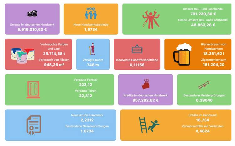 Der Berliner Malerbetrieb Weissmaler GmbH hat einige spannende und unterhaltsame Fakten zum Thema Handwerk in Deutschland gesammelt und auf seiner Webseite in einer Echtzeit-Grafik (Anm. d. Redaktion: Website nicht mehr erreichbar) veranschaulicht. Sekundengenau wachsen die Zahlen. Informationen zum Umsatz des deutschen Handwerks stehen hier neben Zahlen zum Zigarettenkonsum.
