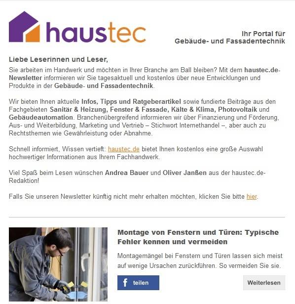 An dieser Stelle möchten wir uns bei unseren zahlreichen Newsletter-Abonnenten für die jahrelange Treue bedanken! Dass wir uns auch heute über hohe Öffnungsraten und positives Feedback freuen dürfen, sehen wir nicht als Selbstverständlichkeit an. Zeit ist ein kostbares Gut, umso mehr freuen wir uns darüber, dass Sie sich die Zeit für den haustec.de-Newsletter nehmen.