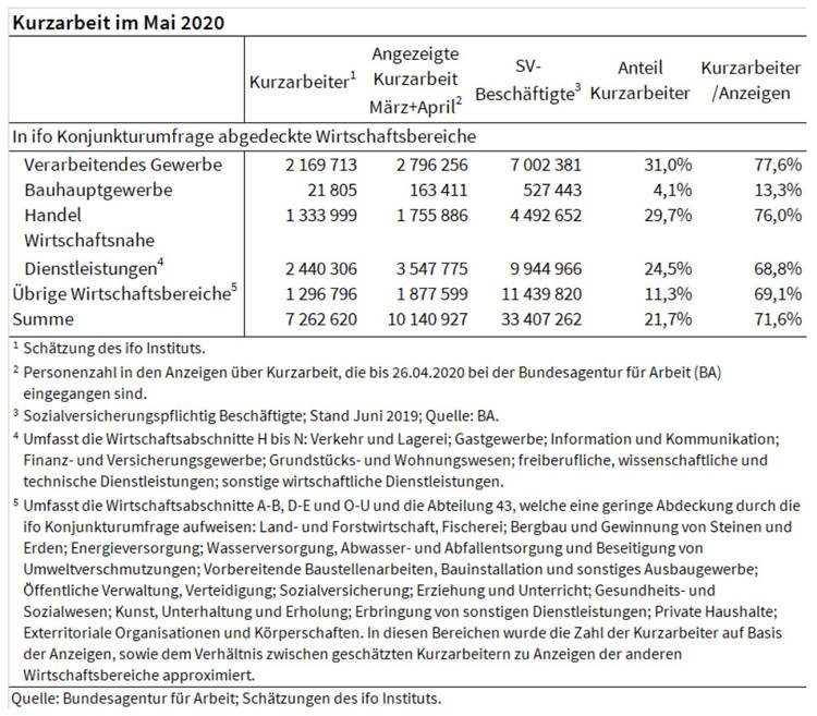 Grundlage dieser Zahlen sind die Konjunkturumfragen des ifo, bei denen im Mai erstmals der Anteil der Kurzarbeiter der Firmen abgefragt wurde.