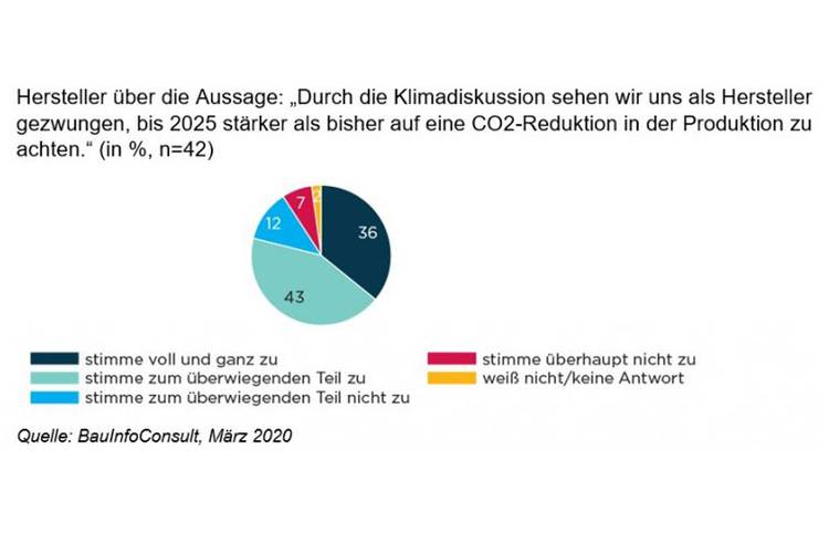 Spätestens mit dem Inkrafttreten des Klimapaketes Anfang 2020 ging die Klimadiskussion an keinem Bauakteur mehr spurlos vorbei. So sehen sich die Hersteller aus der Bau- und Installationsbranche dazu genötigt, bis zum Jahr 2025 stärker als bisher auf die CO2-Reduktion während des Produktionsprozesses zu achten. Vier von fünf der 42 online befragten Entscheider bei namhaften Baumaterialproduzenten stimmten zu, dass es für sie vonnöten sein wird, bis 2025 ihre C02-Hausaufgaben verstärkt anzugehen.