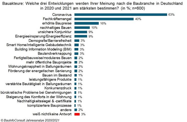 Im April und Mai 2020 hat BauInfoConsult insgesamt 600 Architekten, Bauunternehmer, Maler, Trockenbauer und SHK-Installateure in Telefoninterviews um eine Einschätzung gebeten, welche drei Entwicklungen aus ihrer Sicht 2020 und 2021 das Baugeschehen am meisten prägen werden.