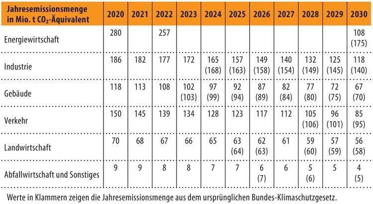 Bis 2030 müssen im Energiesektor nicht nur die zulässigen Emissionen um über 60 % von 280 auf 108 Mio. t CO2-Äquivalent reduziert werden, es müssen auch 140 TWh/a (70 TWh/a durch den Kernenergieausstieg plus 70 TWh/a zusätzlicher Wärmepumpen-Strom) zusätzlich erzeugt werden. Hieraus lässt sich abschätzen, dass die regenerativen Stromkapazitäten von 236 TWh (2019) bis zum Jahr 2030 auf etwa 500 TWh angehoben werden müssen.