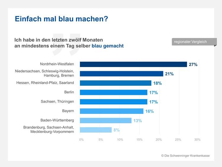 Hochburg der Blaumacher ist Nordrhein-Westfalen, wie eine repräsentative Studie der Schwenninger Krankenkasse zeigt. Hier gaben 27 Prozent aller Arbeitnehmer an, innerhalb der letzten zwölf Monate an mindestens einem Tag blaugemacht zu haben. Am pflichtbewusstesten waren Arbeitnehmer dagegen in Brandenburg, Sachsen-Anhalt und Mecklenburg-Vorpommern: Hier schwänzten im selben Zeitraum nur acht Prozent die Arbeit.