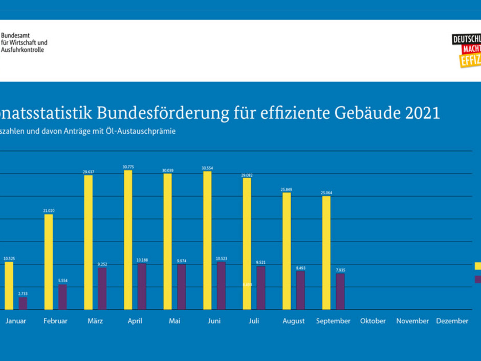 Für den Zeitraum von Januar bis Ende August 2021 hat das Bafa nach eigenen Angaben insgesamt knapp 230.000 Zuwendungsbescheide mit einer Bewilligungssumme von rund 3,7 Milliarden Euro im Rahmen der Förderprogramme für die energetische Gebäudesanierung erstellt. Darunter ist noch ein Überhang aus dem Vorjahr von 70.000 Anträgen aus alten Programmen, die 2021 mit abgearbeitet und entschieden wurden. Knapp 207.500 Anträge kamen 2021 neu dazu.
