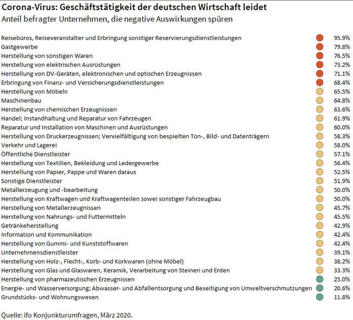 Am schlimmsten ist die Lage bei den Reiseveranstaltern und Reisebüros, wo fast 96% negativ betroffen sind. Das ergab eine aktuelle Umfrage des ifo Instituts unter knapp 3.400 Firmen in Industrie, Handel und bei Dienstleistern. Auch das Gastgewerbe mit 79% ist stark beeinträchtigt. Von einer positiven Auswirkung berichten nur 2,2% aller Firmen.