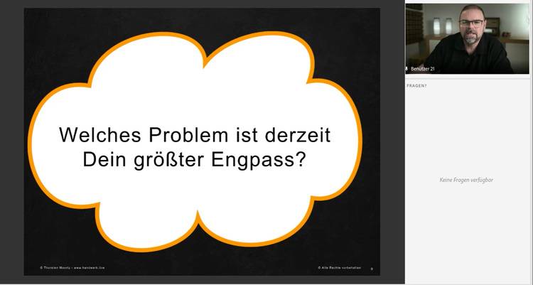 Handwerks-Coach Thorsten Moortz teilte Ideen und Erfahrungen aus seiner Coaching-Praxis: Mit seiner Hilfe schaffen kleine wie große Handwerksbetriebe, vier bis vierzig Anfragen zu Wärmepumpen pro Woche erfolgreich zu verwalten. Durch die systematischen Ansätze, die er in den Unternehmen implementiert, bleibt der gute Kontakt zum Kunden erhalten und wird - ganz nebenbei - auch das Problem der Lieferengpässe mit gelöst.