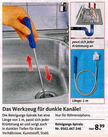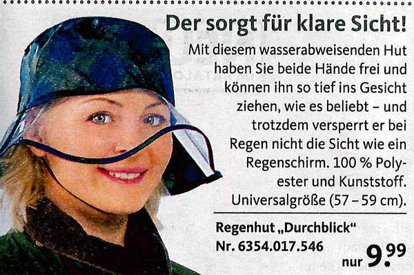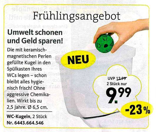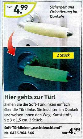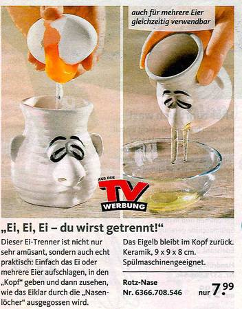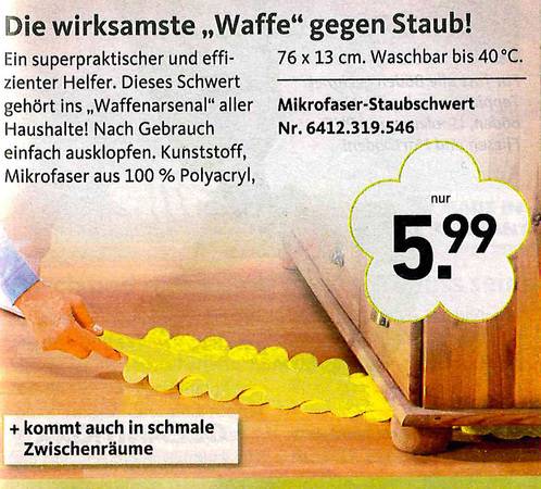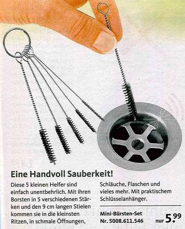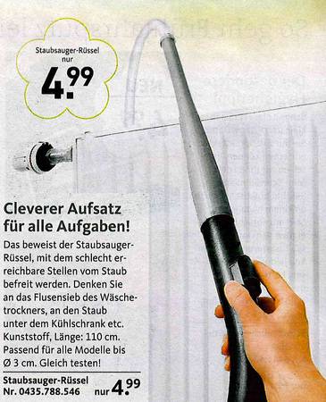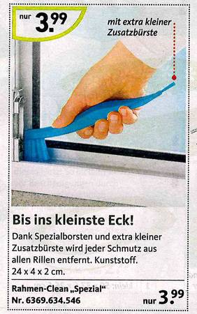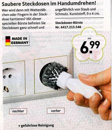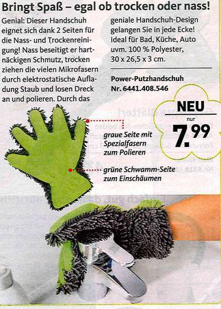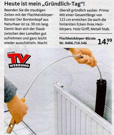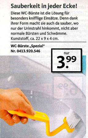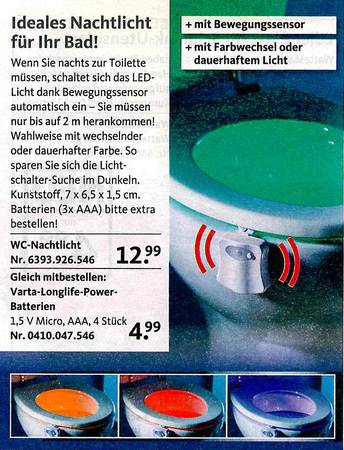 Sie haben sich schon immer gewünscht, dass Ihre Toilette nachts bunt leuchtet? Oder eine Bürste dazu für "besonders knifflige Einsätze? Dann sind Sie richtig beim Versandkatalog "Die moderne Hausfrau". Vom Murmeltieröl gegen Muskelkater übers "Minuten-Miau" bis zum Schmutzradierer für die Fliesenfuge gibt's dort alles, was es eigentlich nicht gibt. Aber unbedingt geben sollte. Zum Glück hat es jemand erfunden! Wir haben die besten Produkte rund ums Haus ausgesucht. Und bitte auch den Text beachten - der ist oft besser noch als das Bild!