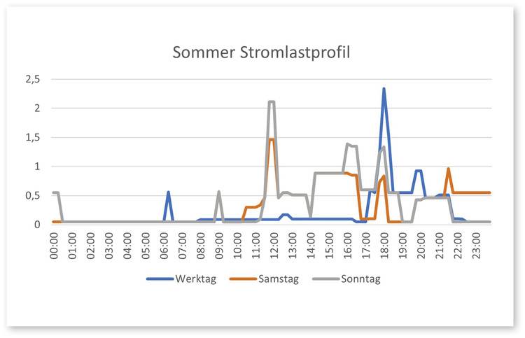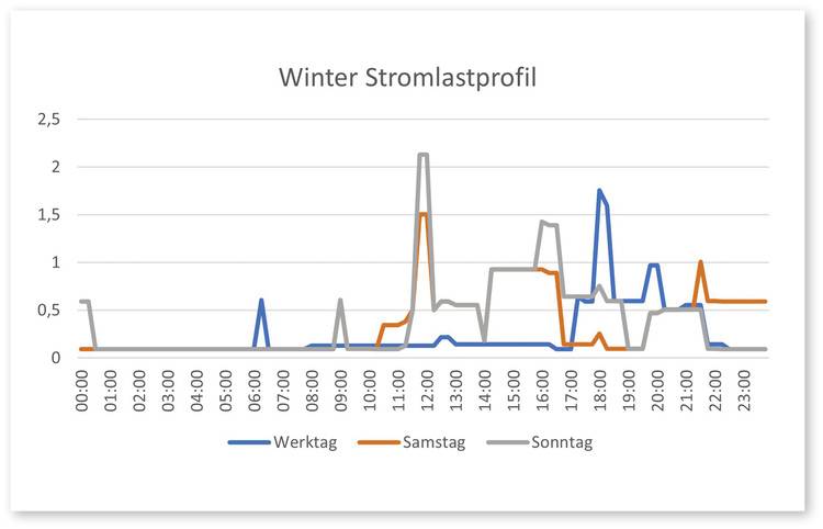 Die Planungsphase beginnt mit der Erstellung des Lastprofils für den Haushaltsstrom und einer Analyse der Stromlastprofile im Sommer (Abb. 1) und im Winter (Abb. 2), um den Gesamtstrombedarf des Gebäudes einschließlich Mobilität, Heizung und Kühlung zu ermitteln. Bei der Betrachtung der Stromlastprofile für Winter und Sommer fällt auf, dass zwischen den Jahreszeiten in den Kurvenverläufen keine signifikanten Unterschiede bestehen, da der Alltag keine grundlegenden Veränderungen erfährt. Unterschiede treten lediglich in der Grundlast durch Heizung beziehungsweise Kühlung und der Nutzung von Lampen auf, die aufgrund der LED-Technologie in den Graphen nicht deutlich hervorstechen.