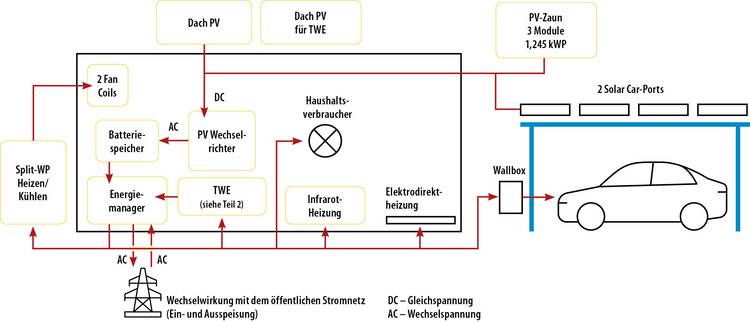 Dies wird durch ein Sanierungskonzept ermöglicht, das die gleichzeitige Optimierung der Gebäudehülle mit dem Ziel anstrebt, den Passivhausstandard weitestgehend zu erreichen. Abb. 4 illustriert die Integration der PV-Module als Erzeugerseite in Verbindung mit den Verbrauchern des Gebäudes.