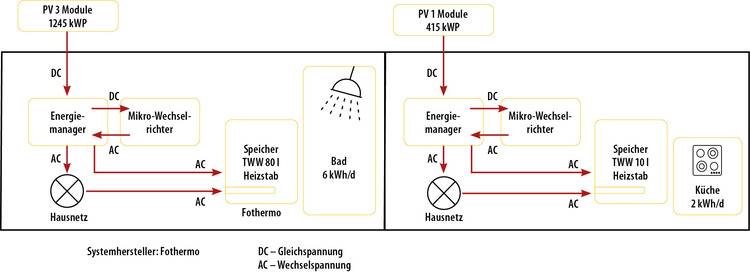Die Trinkwassererwärmung wird ebenfalls in das Ziel einbezogen, fossile auszuschließen. Dies erfolgt durch den Einsatz elektrifizierter Kleinspeichersysteme, die den Bedarf an Trinkwarmwasser vorwiegend solarelektrisch decken. Dabei werden Heizelemente genutzt, um das Wasser zu erwärmen und eventuelle Überschüsse zunächst ins Hausnetz einzuspeisen. Zu diesem Zweck wurden jeweils ein vorzugsweise photovoltaisch versorgtes Trinkwassererwärmungssystem mit Mikrowechselrichter in Bad und Küche installiert (Abb. 5).